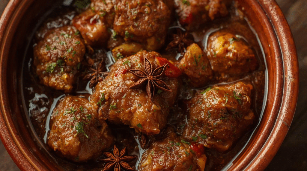 Luxury restaurant photo of Cheken Khara Masala is a delectable and flavorful dish from the rich culinary tradition of South Asia. It features tender pieces of chicken simmered in a vibrant and aromatic blend of spices, creating a rich and savory masala. The dish typically includes ingredients like onions, tomatoes, garlic, ginger, and a variety of spices such as cumin, coriander, turmeric, and garam masala, which come together to form a thick, spicy gravy. This dish is often garnished with fresh coriander leaves and served with steaming hot naan or rice, making it a hearty and satisfying meal. Its robust flavors and aromatic spices make Cheken Khara Masala a favorite among those who appreciate the bold and diverse tastes of South Asian cuisine.