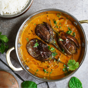 A rich and flavorful dish made with eggplants cooked in a spicy peanut and sesame seed gravy.